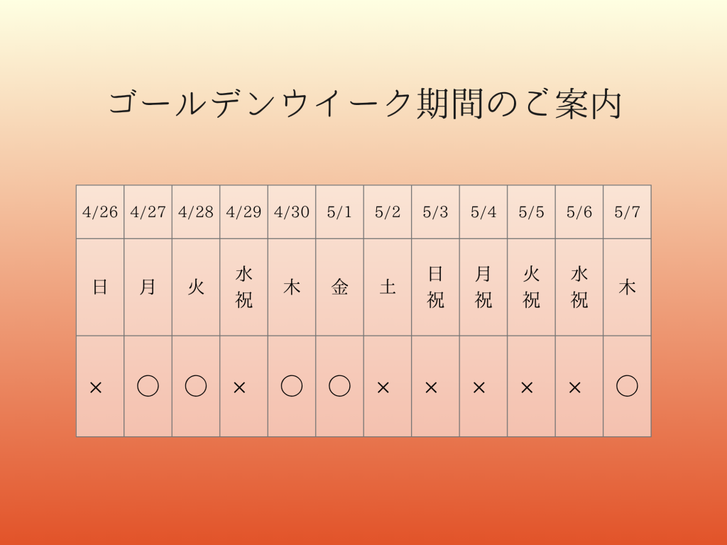 誠に勝手ながら弊社のゴールデンウイーク期間に伴う受注・配送日を上記画像の日程とさせていただきます。